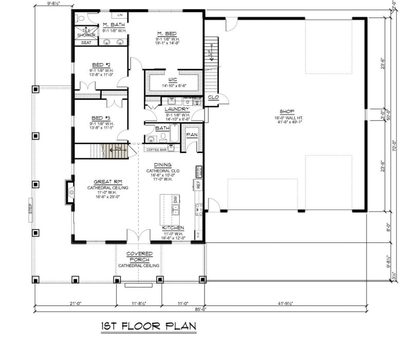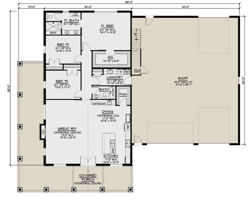 Total Area: 2,039 Sq Ft Width: 86’ Depth: 70’ Stories: 1 Number of Beds: 3 Number of Baths: 2 Garage Capacity: 3 Garage Type: Front/Rear Entry Garage Garage Feature: RV Bay Outdoor: Front Porch, Wrap Around Porch |