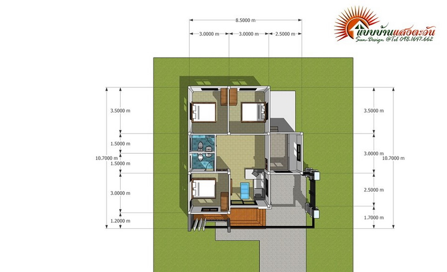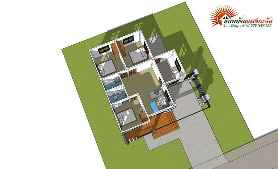 Look at the photos of the featured house below. It’s a modern house with three bedrooms, perfect for a small family.