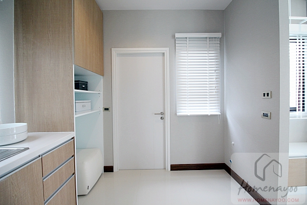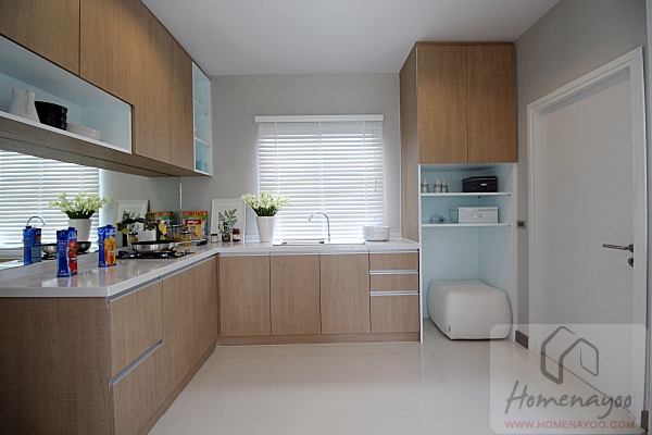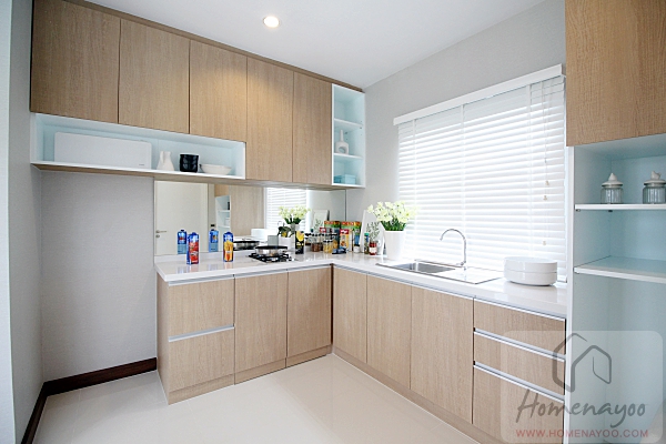 Inside the kitchen, the sample house is made up of L-shaped counter tops with a top and bottom built-in storage.