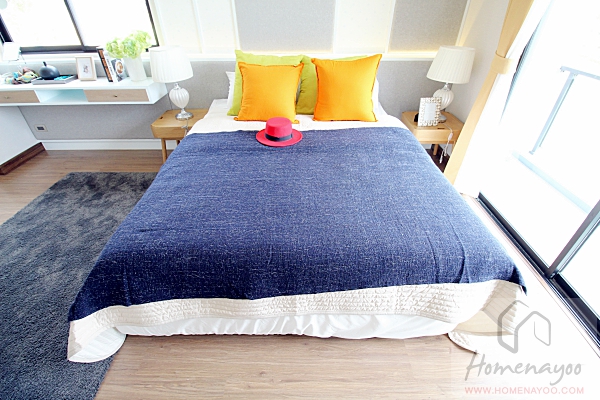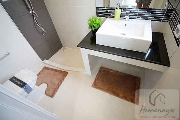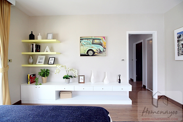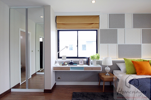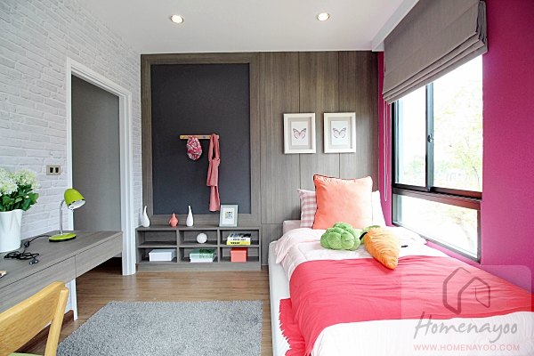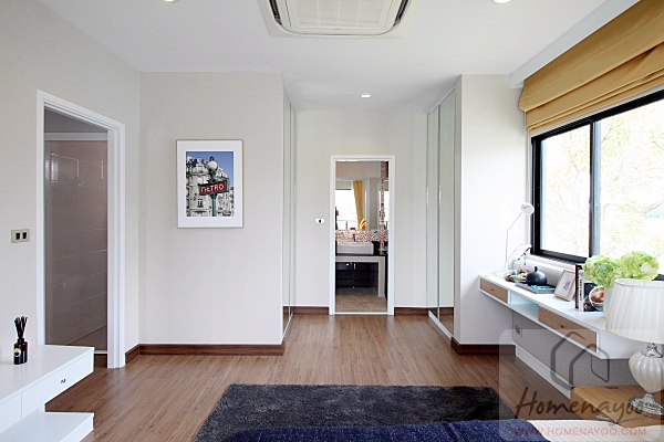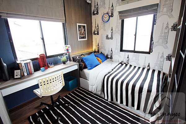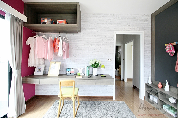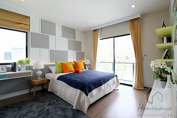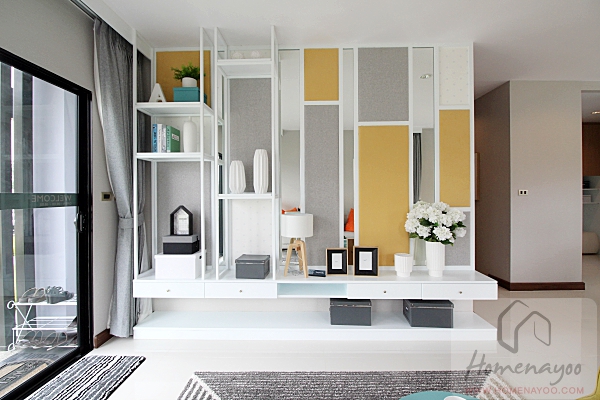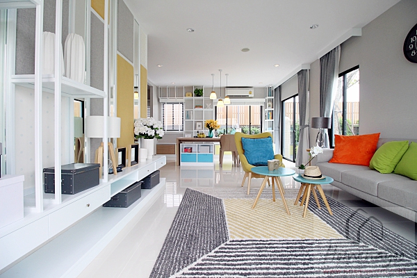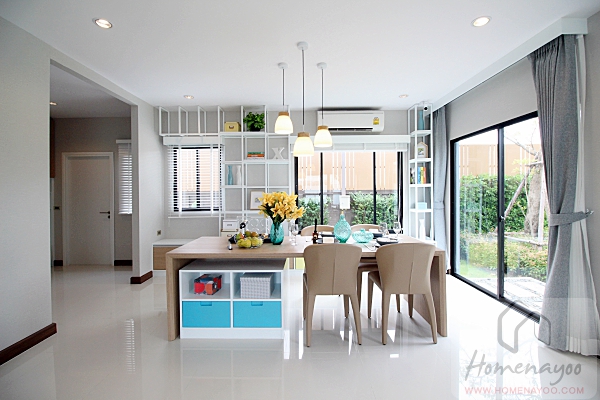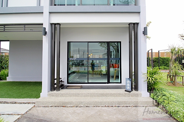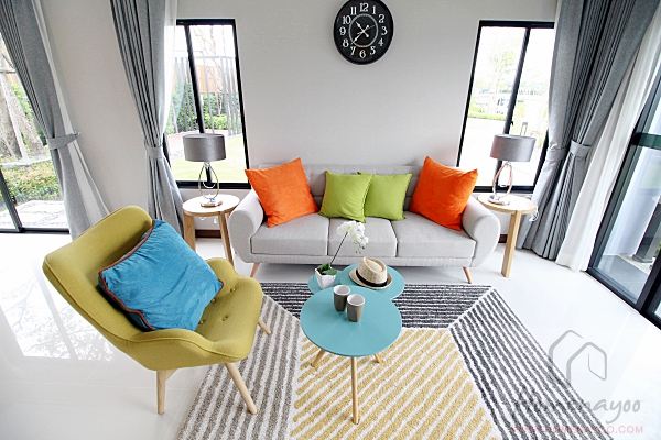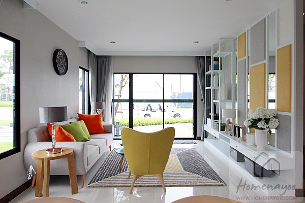 The living room is a three-seater sofa. With armchairs, side tables and coffee tables for casual use. The window frame is a black aluminum frame. Two sides of the sofa Let’s have a big bloom. Make the house look bright and airy.