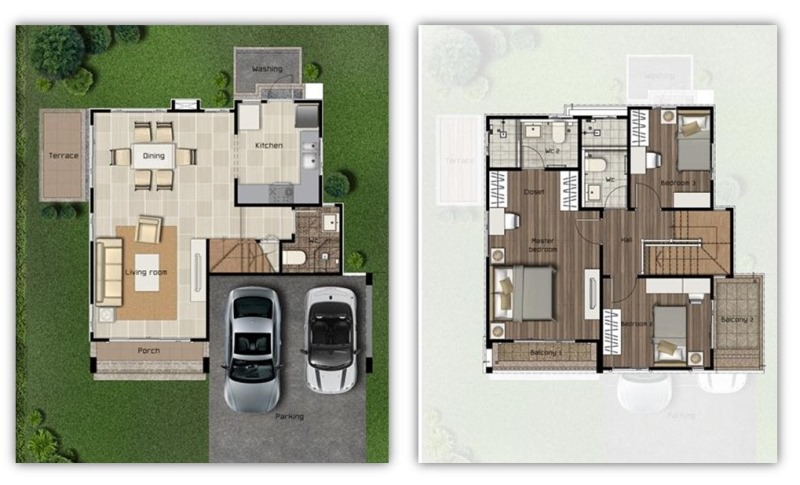 The second floor consists of 3 bedrooms, 2 bathrooms, master bedroom with en suite bathroom and walk-in closet with balcony, and two small bedrooms share bathrooms. The small bedroom in front of the house will also have a balcony as well.
