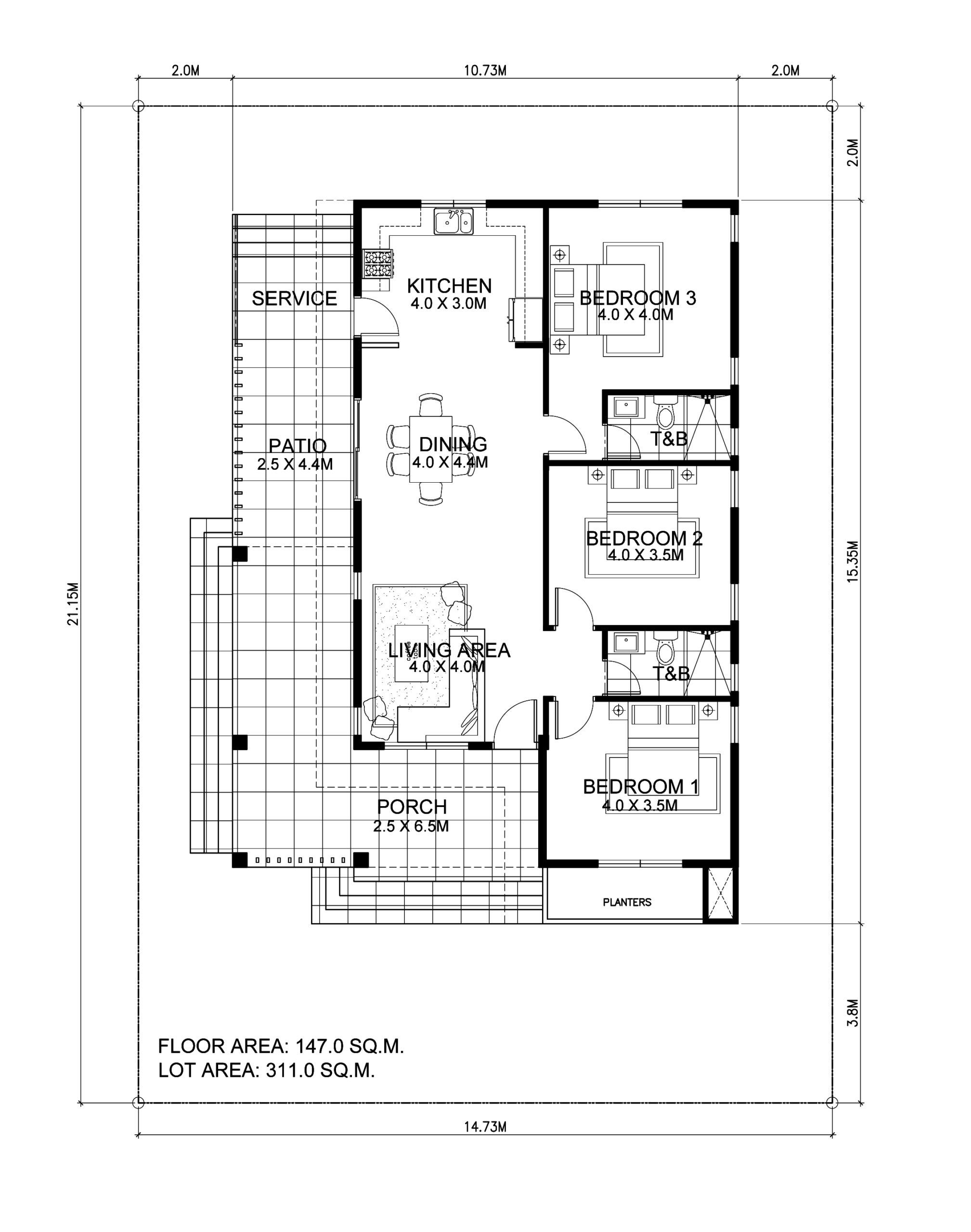 This design is 147 square meters total floor area that will require at least 300 square meters lot. If you have a lot the is 15 meters in frontage width and 21 meters in depth, this design is absolutely for your taking.