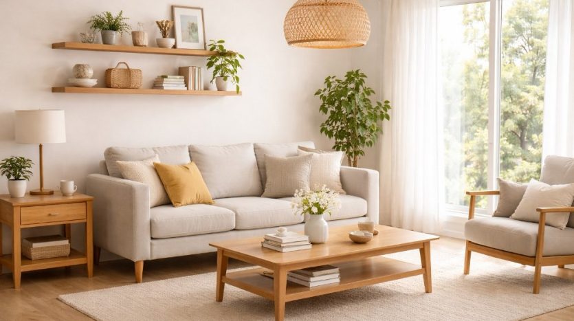 You’re renting and can’t make permanent changes. Swap out a basic lampshade for one with a wooden or bamboo frame. Place a wooden tray on your coffee table to corral remotes and coasters. These small additions take minutes but change how the space feels. No drilling required. No landlord approval needed.