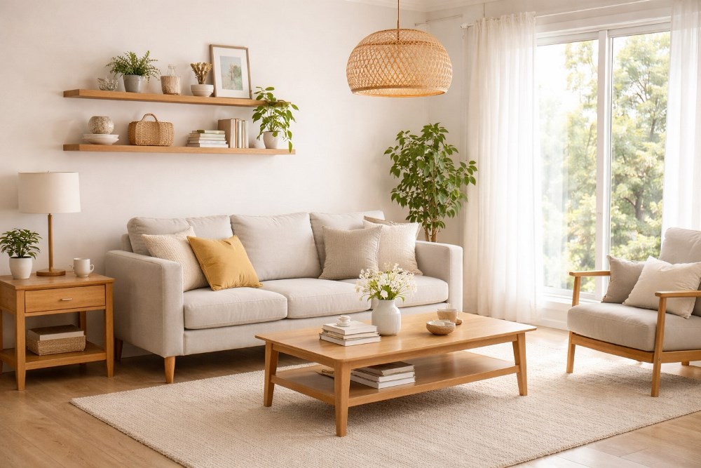 Your living area looks fine but feels cold. Start with one statement piece. Wooden light fixtures above your seating area work well as a focal point. Then layer in smaller accents: a plant stand, picture frames with wood borders, or a simple wooden clock. Build gradually rather than all at once. Let each piece settle before adding the next.