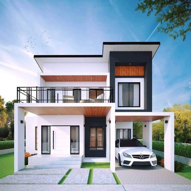 Additionally, one of the highlights of this house is the pleasantness and coolness of the exterior facade. In fact, it outstandingly shines in a dominant white color. In contrast, the brown ceilings and grey outlines in darker colors added some touch of beauty and appeal. Furthermore, the overall comfort of the house is at a high level considering the following: space, glass medium, balcony, and the surroundings.